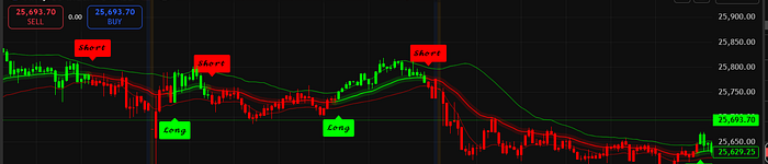 图表上那些”Long”和”Short”的标签,只有当结构确认之后才会出现,而不是随便弹出来的。很多人看到价格突破绿色带就急着往里冲,这是不对的。趋势带只告诉你”多头方向现在是被允许的”,但你还需要等下面两层信号一起确认,才能行动。