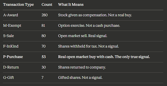 写在前面的话:本文通过分析SEC内部人交易数据,揭示了一个重要发现:公开市场上的"内部人买入"大多数并非真正的现金购买,只有公开市场购买才是真正值得关注的信号,投资者应该重点关注这类真正的现金购买信号,并结合分析方法做出决策。
