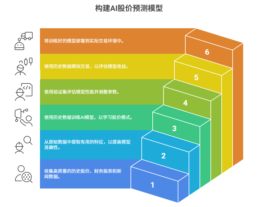 我们接下来通过6步搭建你的AI股价预测模型:具体流程为:数据获取 → 特征工程 → 模型训练 → 验证调优 → 回测 → 应用。