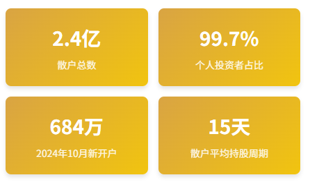 数据显示,2024年10月新开户684万户创9年新高,这些新手正好赶上’9·24行情’高点,成为接盘侠。散户平均持股周期仅15天,机构平均持股3年,这种差异注定了散户的悲惨命运。