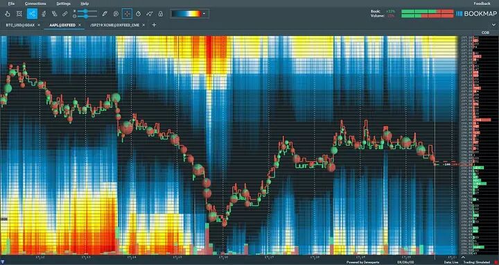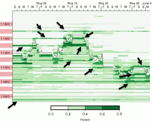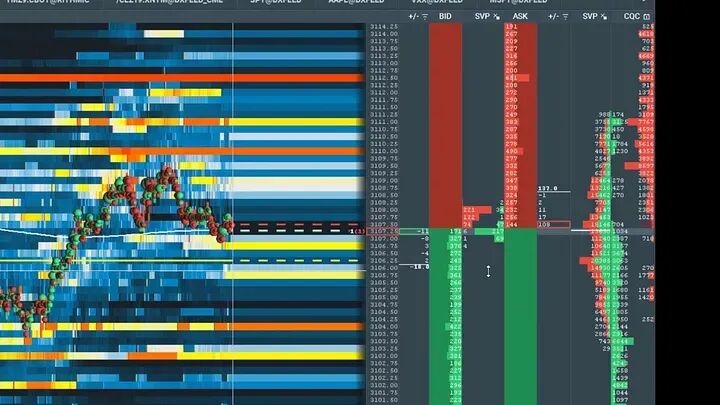 量化系统热力图显示实时订单簿流动性。明亮的条带表示大额的限价单。活跃的订单流和突然的流动性扫荡表明存在容易受到止损单攻击的区域。