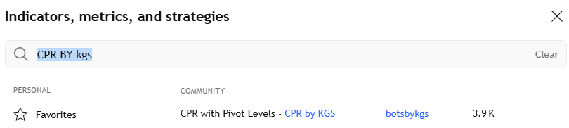 打开TradingView,选择您想要交易的图表,然后搜索 CPR BY KGS ,选择botsbykgs的版本,并将其添加到图表中。