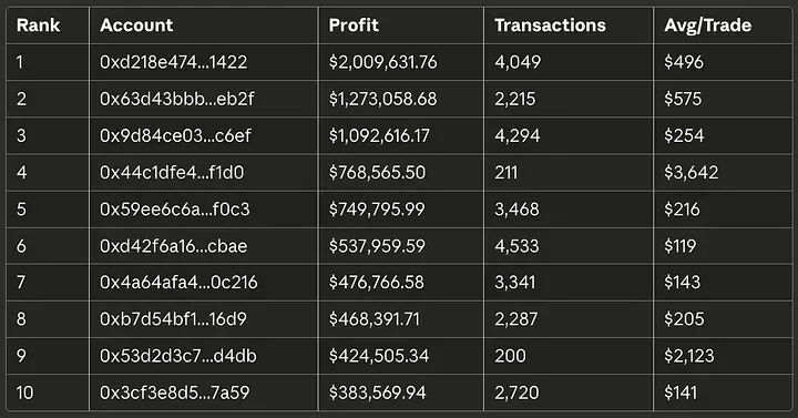 前十名玩家总共赚取818万美元,占总套利收益的20.7%,符合典型的幂律分布——少数人赚走大部分钱。我们看一下排名前十的玩家数据: