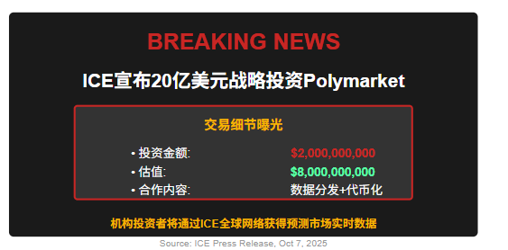 2025年10月7日,纽约证券交易所母公司洲际交易所(ICE)宣布向Polymarket投资高达20亿美元。这标志着专业机构开始进入预测市场领域。