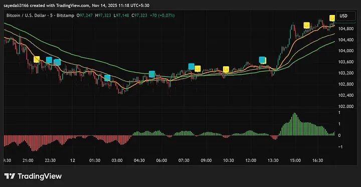 2. 最佳食用周期:原文作者推荐5分钟和15分钟图。我测试了一下,对于比特币、黄金这种波动大的品种,5分钟图简直是印钞机;但对于波动小的品种,建议看15分钟,更稳。