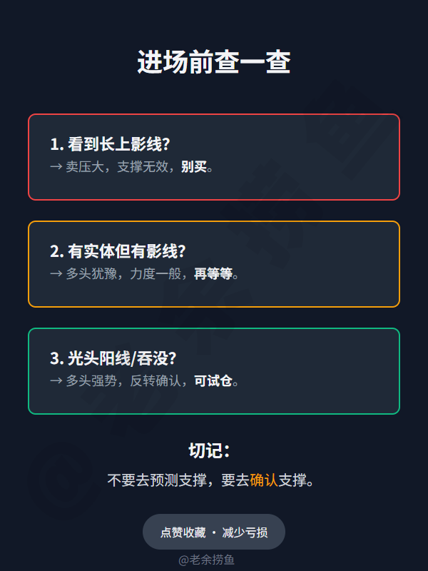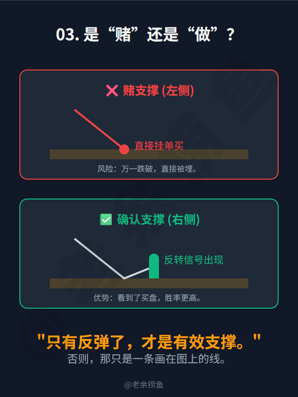 💡交易不是赌博。 不要挂单在支撑位去“赌”它撑得住 。 要等K线收盘,看到多头确实撑住了,并且发起了反击(右侧确认),这时候进场才是交易 。