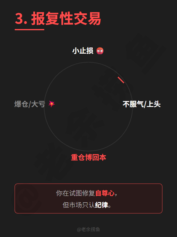 老余捞鱼真相时刻: 你下一笔交易根本不是在看图表,你是在试图修复你受损的自尊心(Ego)。你不服气,你觉得市场欠你的。但在市场眼里,你什么都不是,它只会专治各种不服。