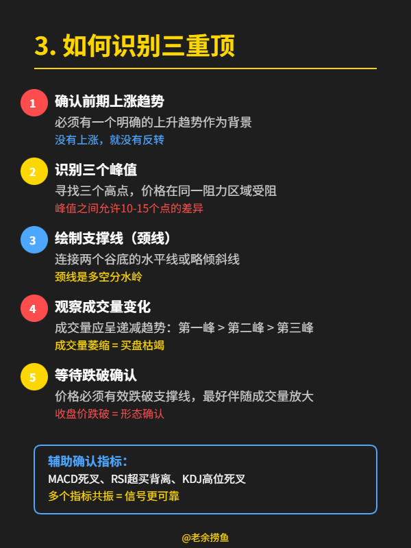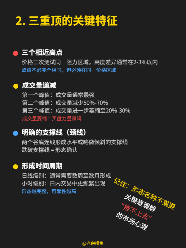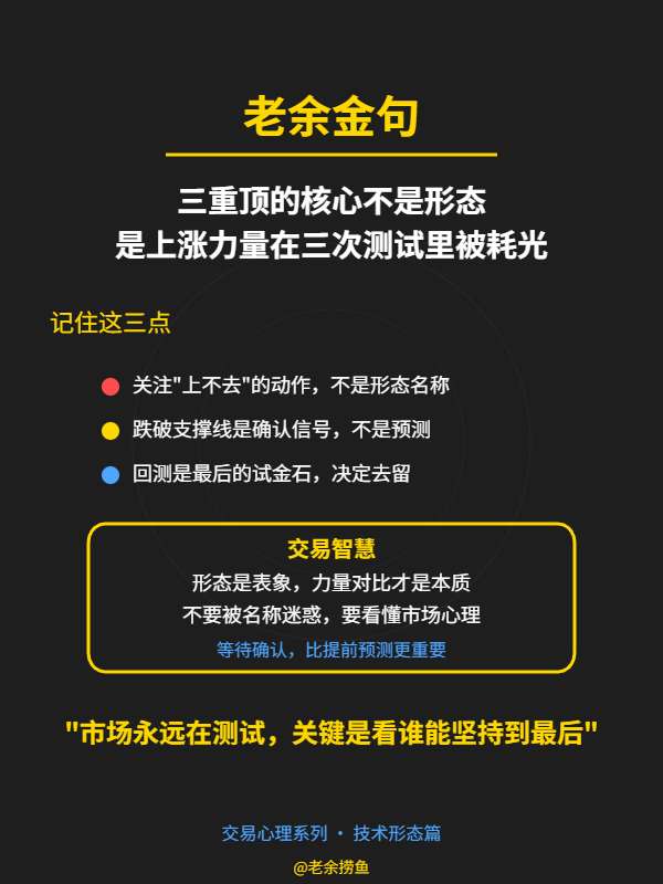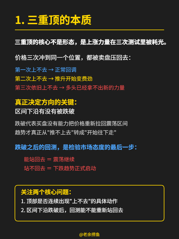 技术笔记 | 三重顶的本质:耗尽与确认的艺术 作者:老余捞鱼原创不易,转载请标明出处及原作者。💡三重顶真正要关注的只有两件事:1.顶部是不是连续出现“上不去”的具体动作(测试失败)。2.区间下沿跌破后,回测能不能重新站回去。其他形态名称都不重要。#技术分析 #价格行为 #交易心理 #市场结构 #图表解读 #趋势判断 #风险管理 #交易体系不吝点赞和分享,您的支持是我持续创作的动力。祝您投资顺利,收益长虹!如果对文中内容有任何疑问,欢迎留言,我会尽快回复!本文内容仅限技术探讨和学习,不构成任何投资建议。Published inAI&Invest专栏手把手教你ai顾投