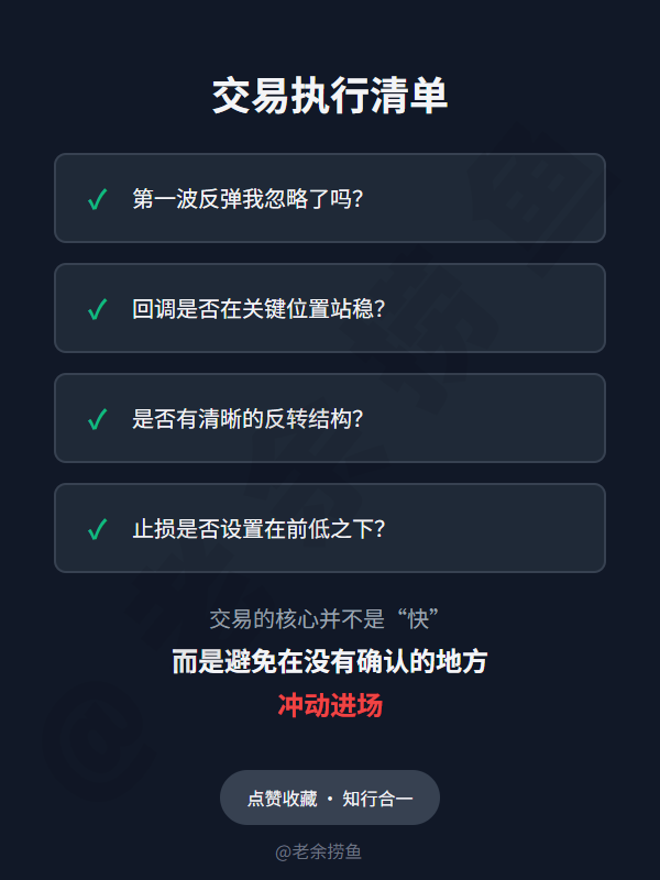 流程的核心并不是“快”,而是“确认”。 很多时候你亏钱,不是因为方向错了,而是因为你太着急,在第一波反弹(情绪盘)里冲了进去,结果被回调打爆。