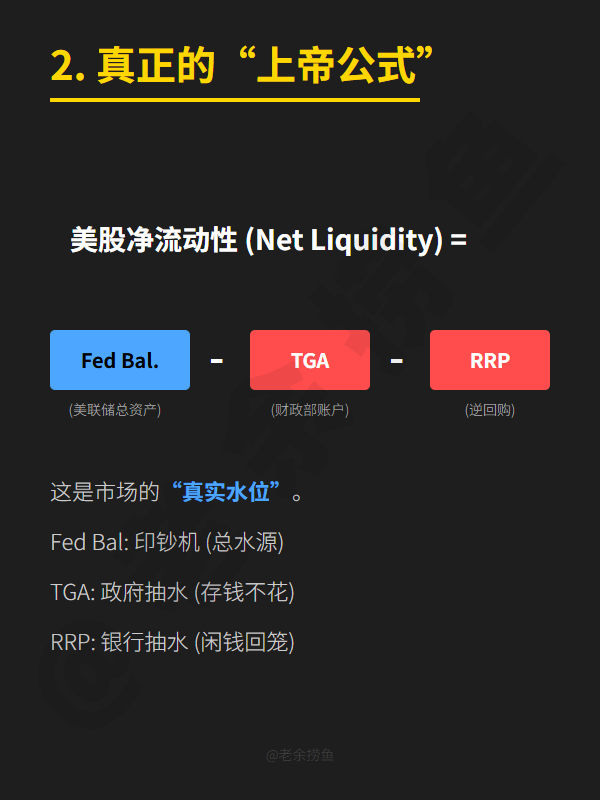 一张图看懂“净流动性”:美联储是如何通过TGA和RRP调控股市的 作者:老余捞鱼原创不易,转载请标明出处及原作者。💡别去赌每一次的数据发布,多关注每周四美联储的资产负债表。Don’t fight the Fed. 跟着潮汐游泳,才是最轻松的。#净流动性 #美联储 #TGA #RRP #宏观经济 #老余捞鱼 #金融真相请不吝点赞和分享,您的支持是我持续创作的动力。祝您投资顺利,收益长虹!如果对文中内容有任何疑问,欢迎留言,我会尽快回复!本文内容仅限技术探讨和学习,不构成任何投资建议。Published inAI&Invest专栏手把手教你ai顾投