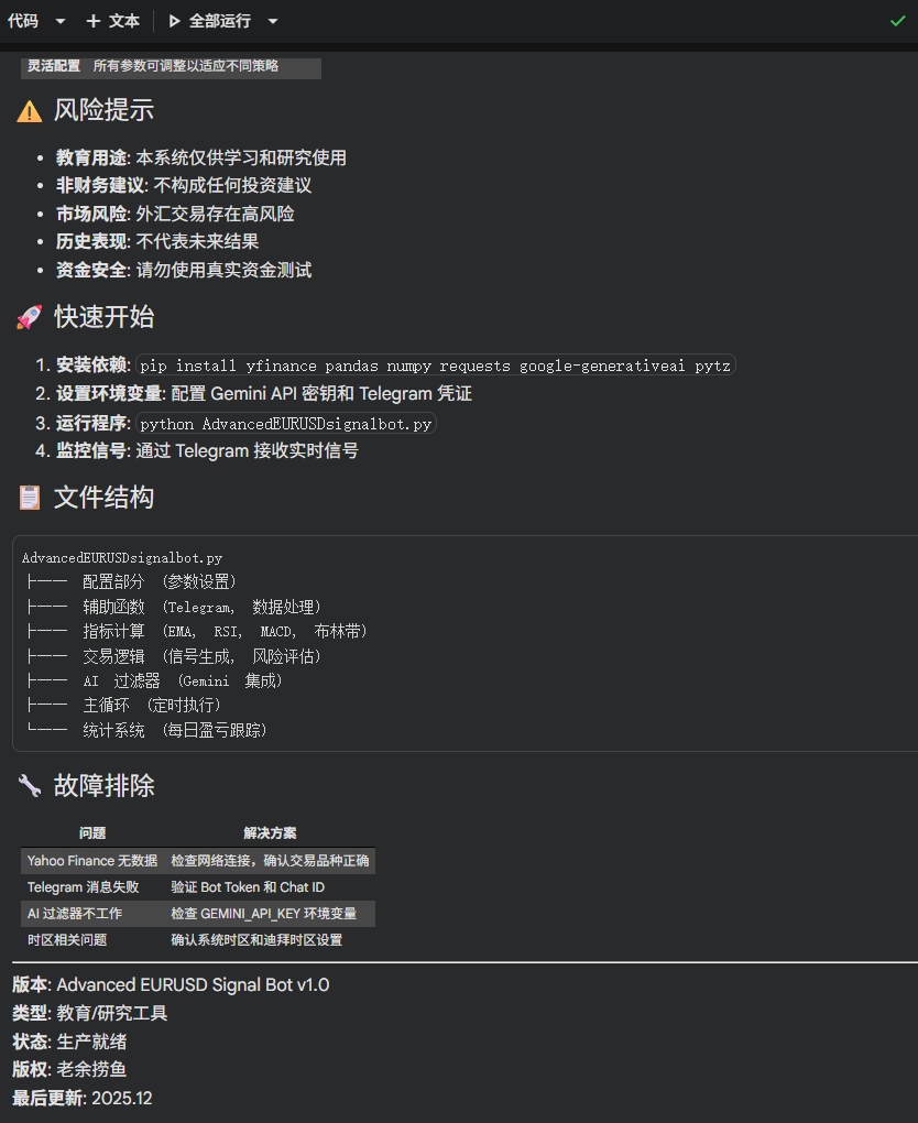 # 交易品种和周期PAIR = "EURUSD=X" # 欧美外汇INTERVAL = "1m" # 1分钟K线# 技术指标参数EMA_FAST = 9 # 快线周期EMA_SLOW = 21 # 慢线周期RSI_PERIOD = 14 # RSI周期MACD_FAST = 12 # MACD快线MACD_SLOW = 26 # MACD慢线MACD_SIGNAL = 9 # MACD信号线BB_PERIOD = 20 # 布林带周期BB_STD = 2 # 布林带标准差倍数# 交易设置CHECK_EVERY_SECONDS = 60 # 每60秒检查一次EXIT_CANDLES = 5 # 持仓5根K线后平仓ONE_SIGNAL_PER_HOUR = True # 每小时只发一个信号# Telegram通知TELEGRAM_BOT_TOKEN = "你的机器人Token"TELEGRAM_CHAT_ID = "你的聊天ID"# Gemini AIGEMINI_API_KEY = "你的Gemini API密钥"💡 如何获取Telegram Bot Token?