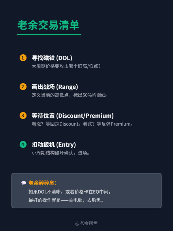 💡 总结: 交易不是比谁点击鼠标快,而是比谁更会等。 如果 DOL 不清晰,或者价格卡在中间不上不下,最好的策略就是空仓。 记住,我们要吃的是鱼身,不是鱼刺。 🐟