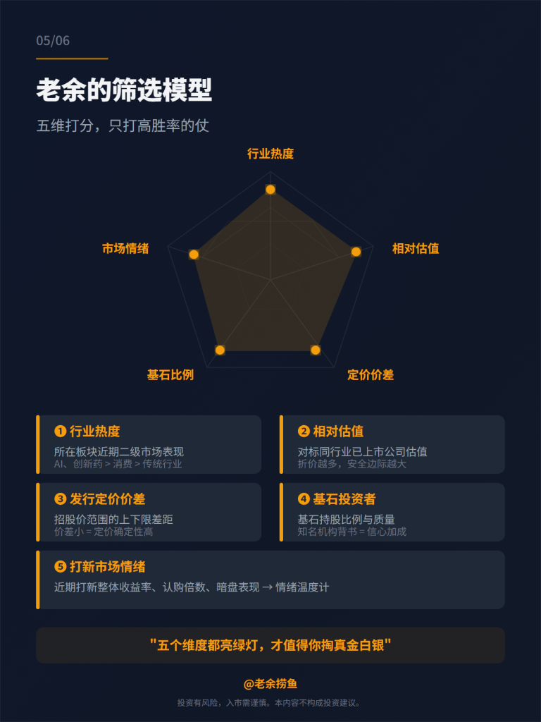 无脑打新的时代结束了。用五维模型筛选——行业热度、相对估值、定价价差、基石比例、市场情绪,至少4个维度亮绿灯才出手。