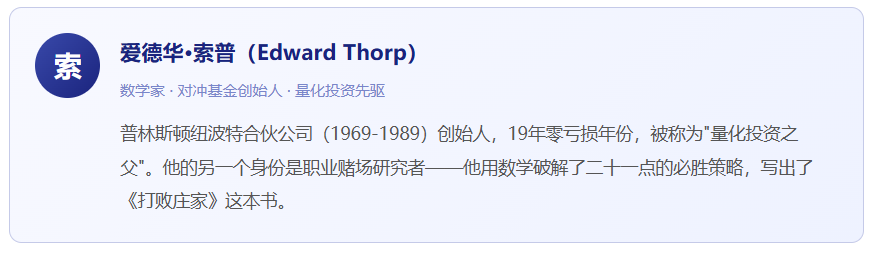 1969年,索普创立了普林斯顿纽波特合伙公司,这是全球第一只真正意义上的”市场中性”对冲基金——也就是说,不管市场整体涨还是跌,他的基金都能赚钱,因为他的策略不依赖市场方向,只依赖定价偏差。