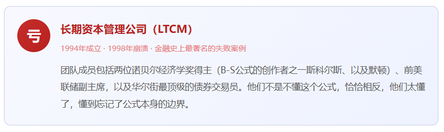 ④ LTCM的失败不是因为公式用错了,而是50倍杠杆叠加拥挤交易,让五大假设在同一时刻全部崩塌。