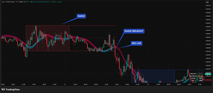 做空信号示例:价格跌破区间下沿且趋势线变红 | 来源:TradingView